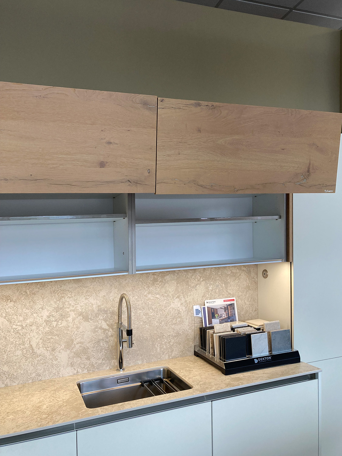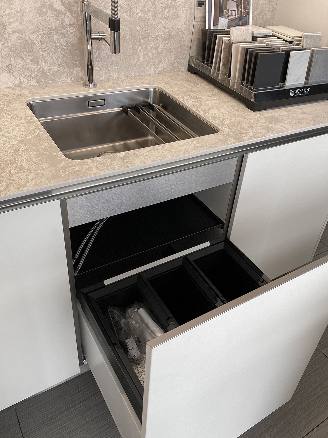 Cena zahrnuje kuchyňský nábytek, keramickou pracovní desku od značky Dekton, podstavný dřez, baterií a odpadkový systém značky Blanco.