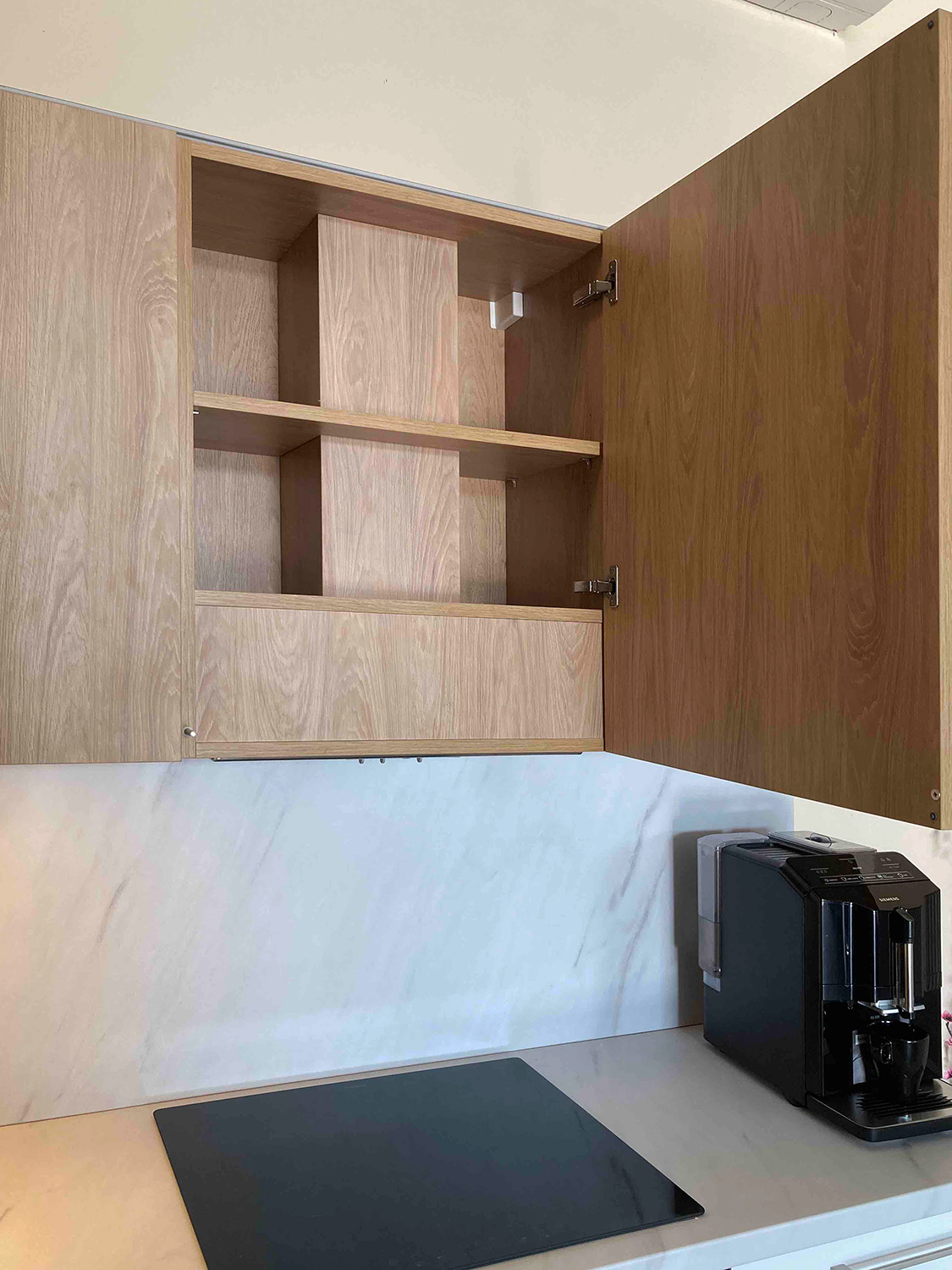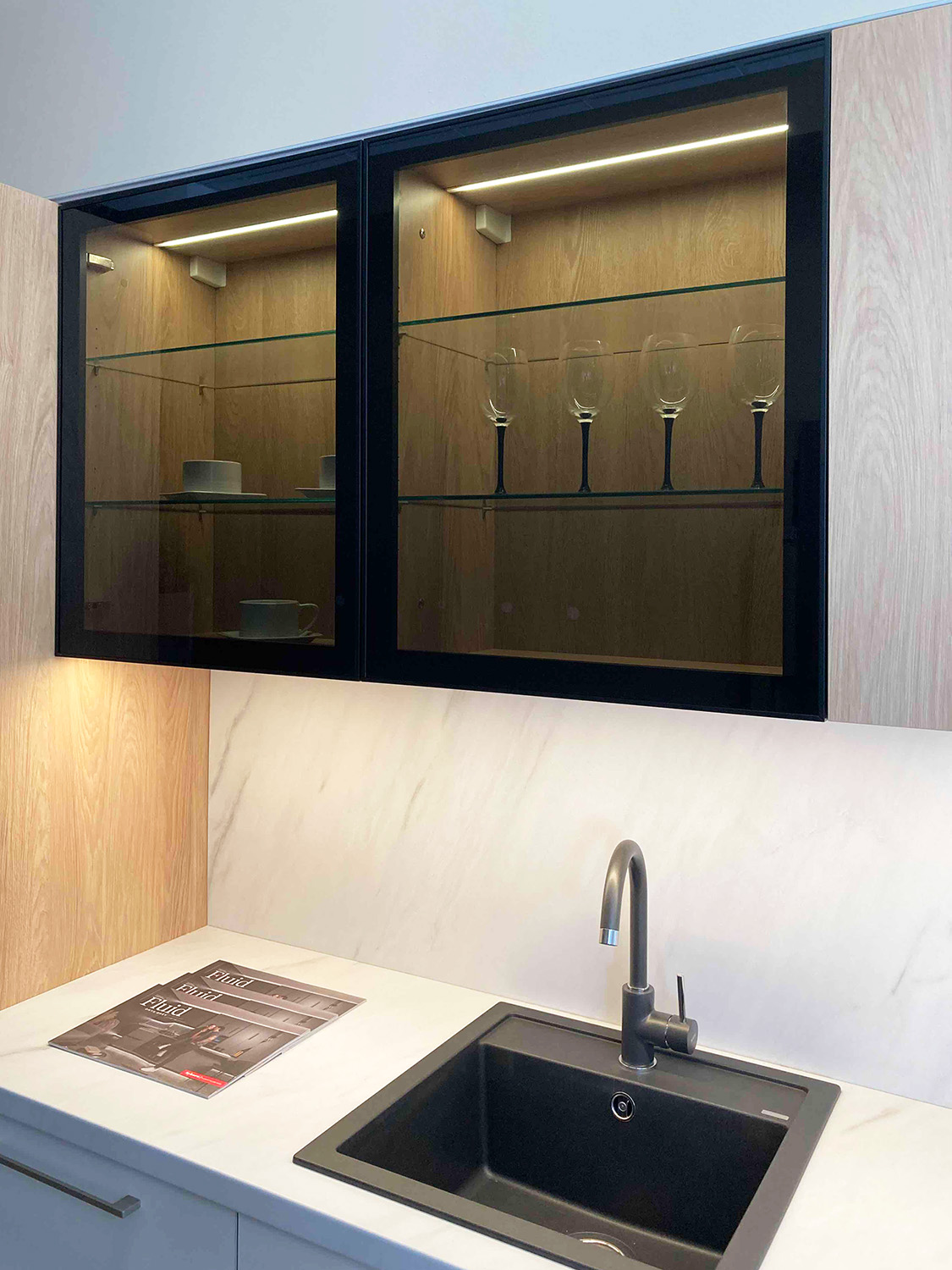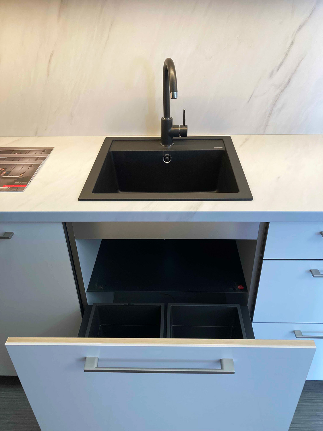 Cena zahrnuje kuchyňský nábytek, pracovní desku, dřez a baterií od značky Blanco, odpadkový systém značky Hailo a vestavný digestoř značky Franke.